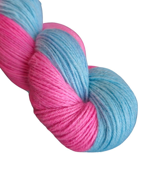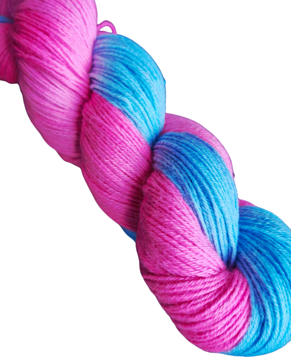 Dit garen is in neon roze en blauw geverfd maar dit garen kun je natuurlijk ook voor vele andere knallende projecten gebruiken. Het garen is lekker zacht en op 1 steng zit 400 meter aan kleurig plezier.